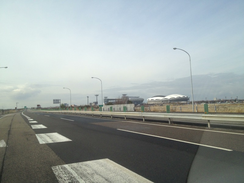 高速にのりました。 野球場とサッカー場がとなりどうし並んでいます!