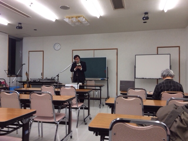 聖会まで少し時間があります。秋元牧師はみ声新聞を読んでおられます。