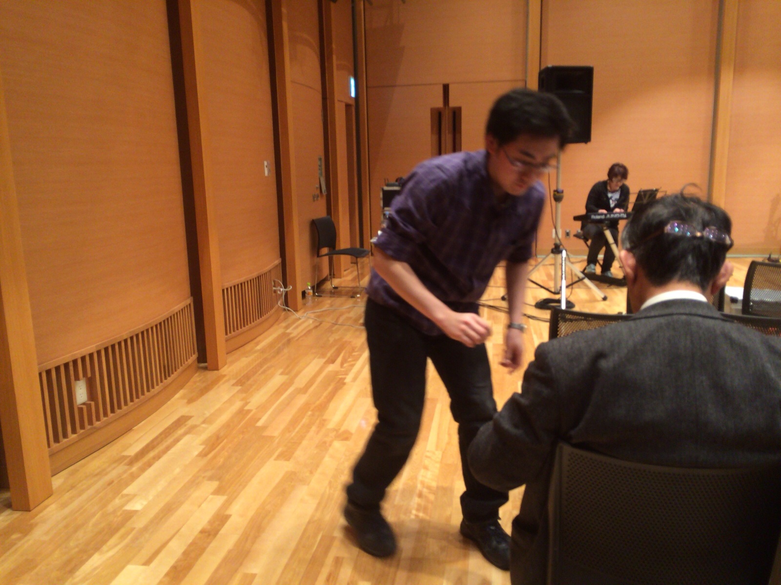 休憩時間です。 ピンマイクのセットをするせいやくん。