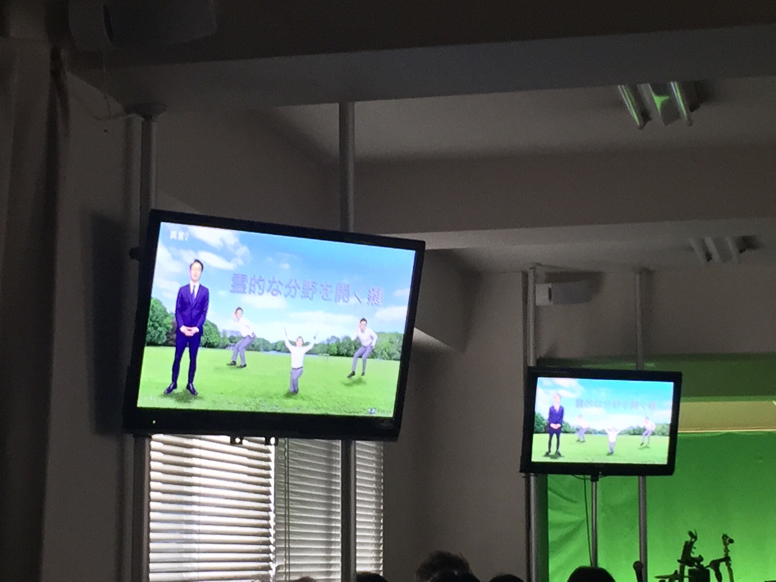 ヨハネくんの後ろで光さんがポーズをとっています。