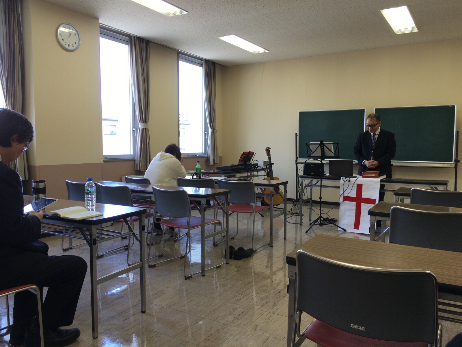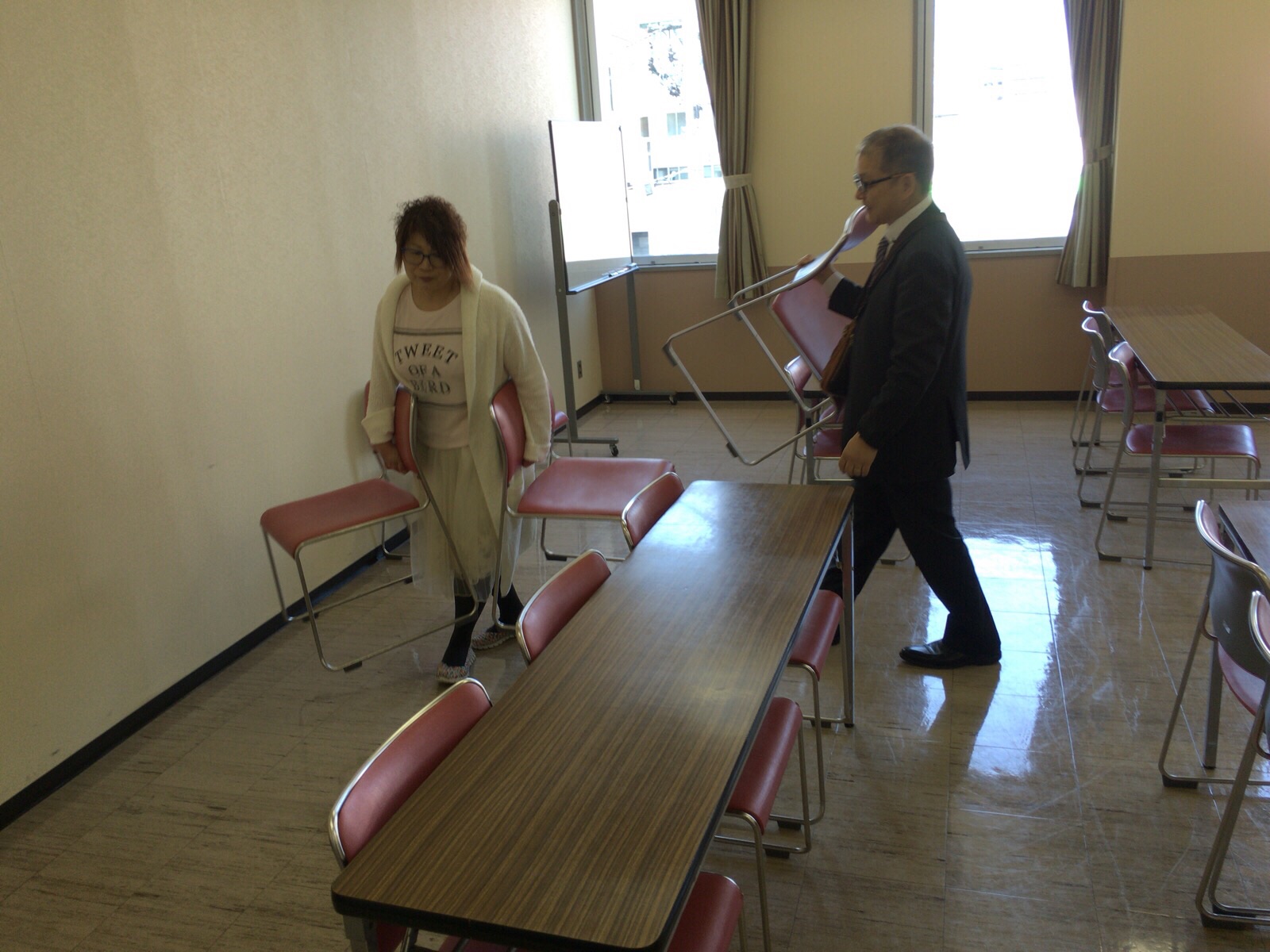 柏崎教会牧師の中村さんと奥さまが会場セッティングしています。