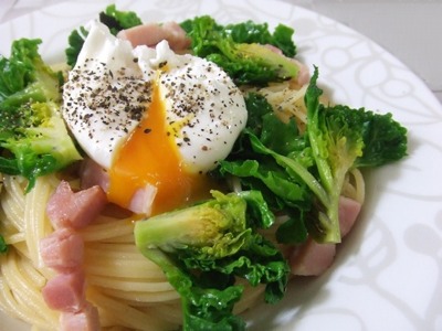 ベーコンとプチヴェールのスパゲッティ ポーチドエッグのせです。 春を感じさせるメニューです。とろりん玉子がたまりません♪