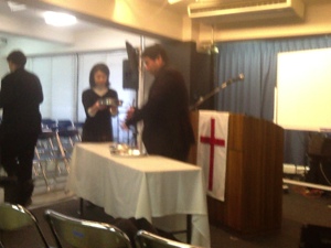 次は聖餐式です。 パンとぶどう酒を配さん中。