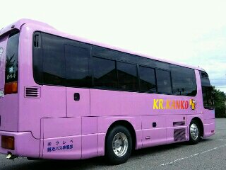 関西バス組、スイス村でトイレ休憩です。集まり次第出発です。 目立つ、よくわかるバス。