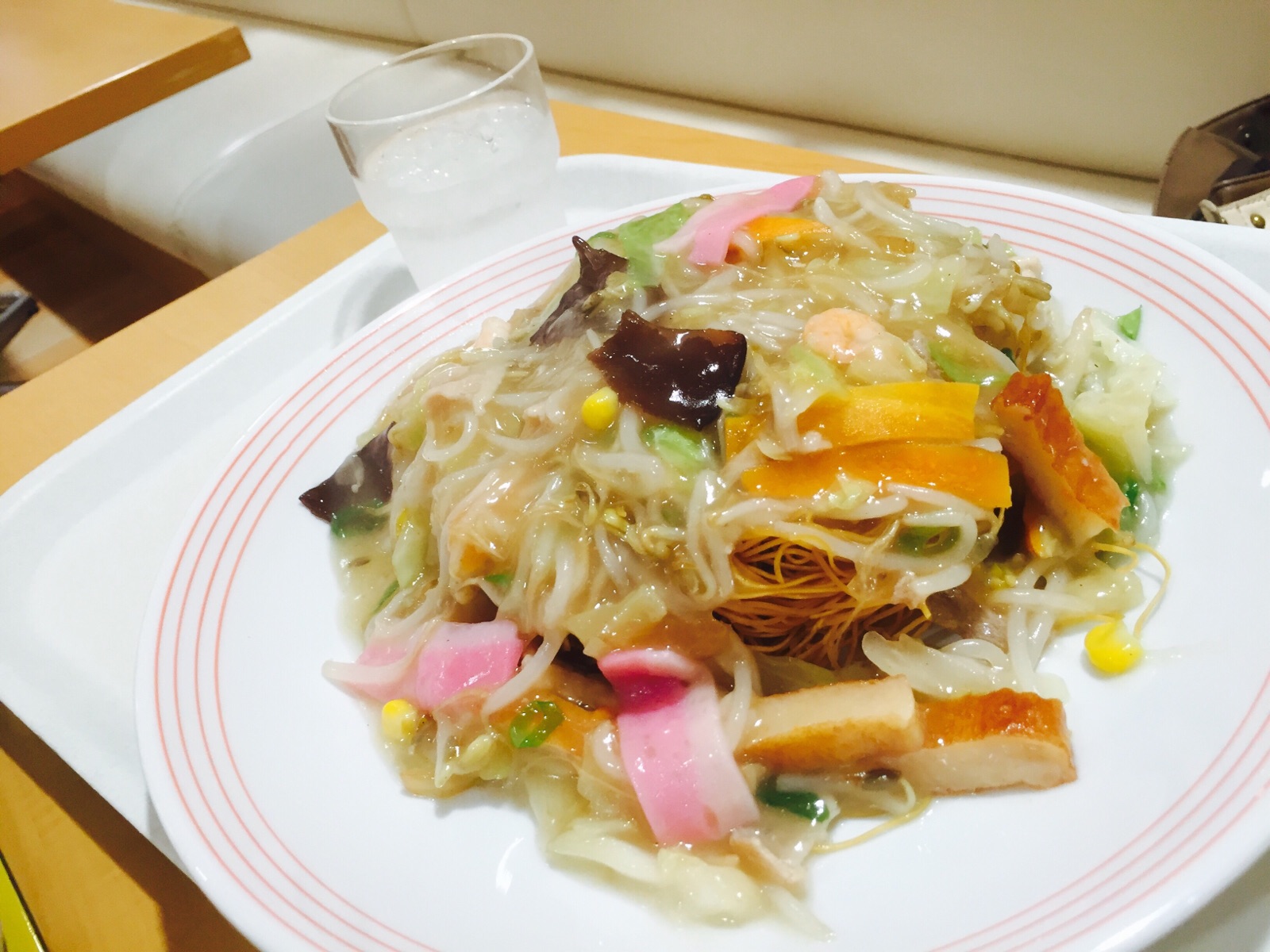 え〜〜、何だか私の家族は美味しそうな海鮮丼やら皿うどんやら食べてますが私はママンのお弁当食べますよ、(._.)