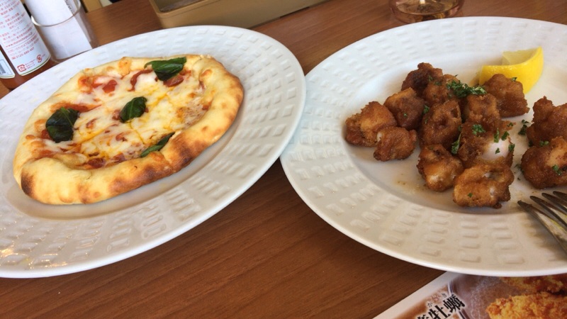 でも 案外早く座れました。 朝ご飯をちょっと食べ過ぎたんで お昼はちょっとだけ。 ピザは小さいもの。 mariko