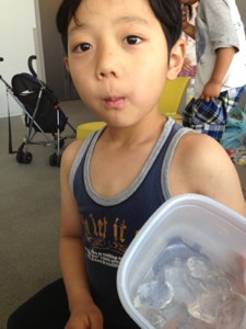 会場の外は暑いので、子ども達は、氷をほおばります(^o^)