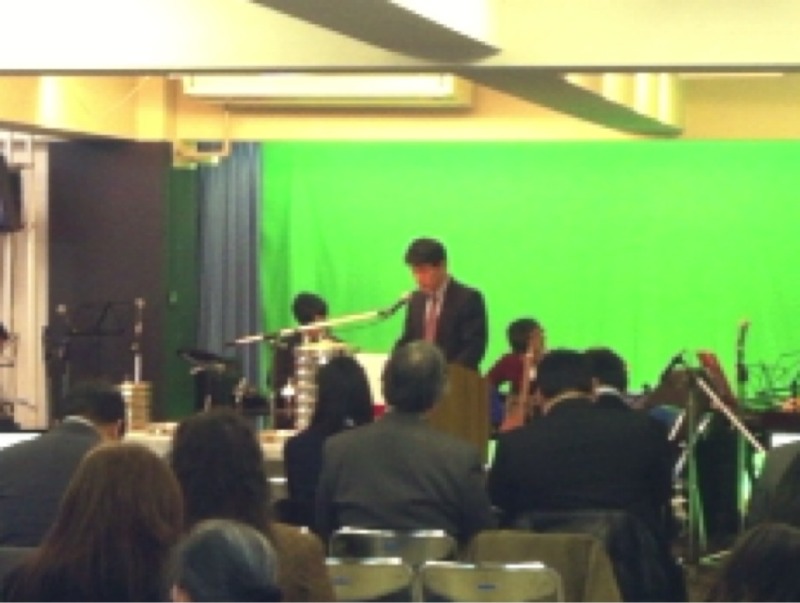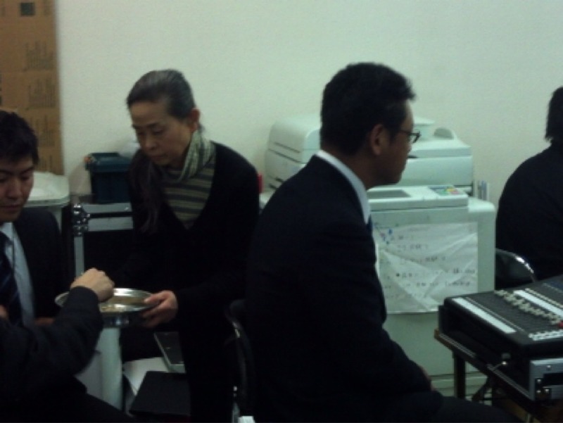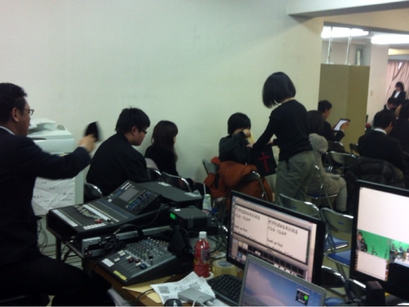 賛美選曲のチェック中、ダビデ前田牧師。 エステル