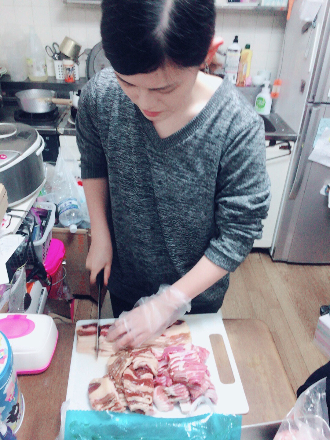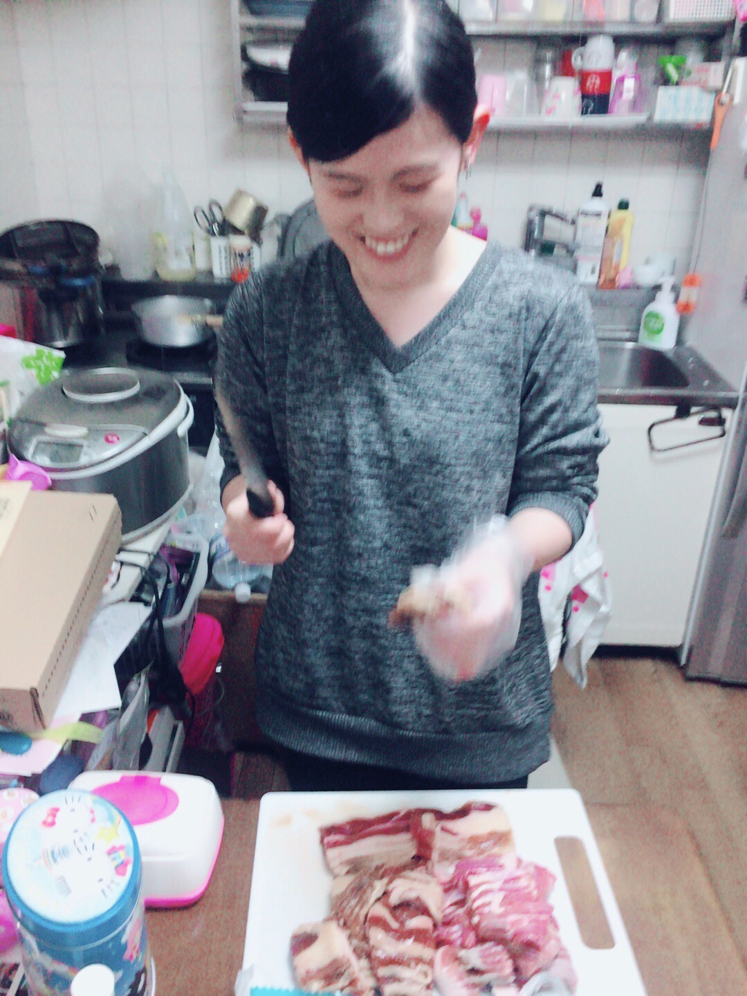 我が家で焼肉パーティ♪ 楽しそうに肉を切るテヒです^ – ^ ダニエルಠ_ಠ