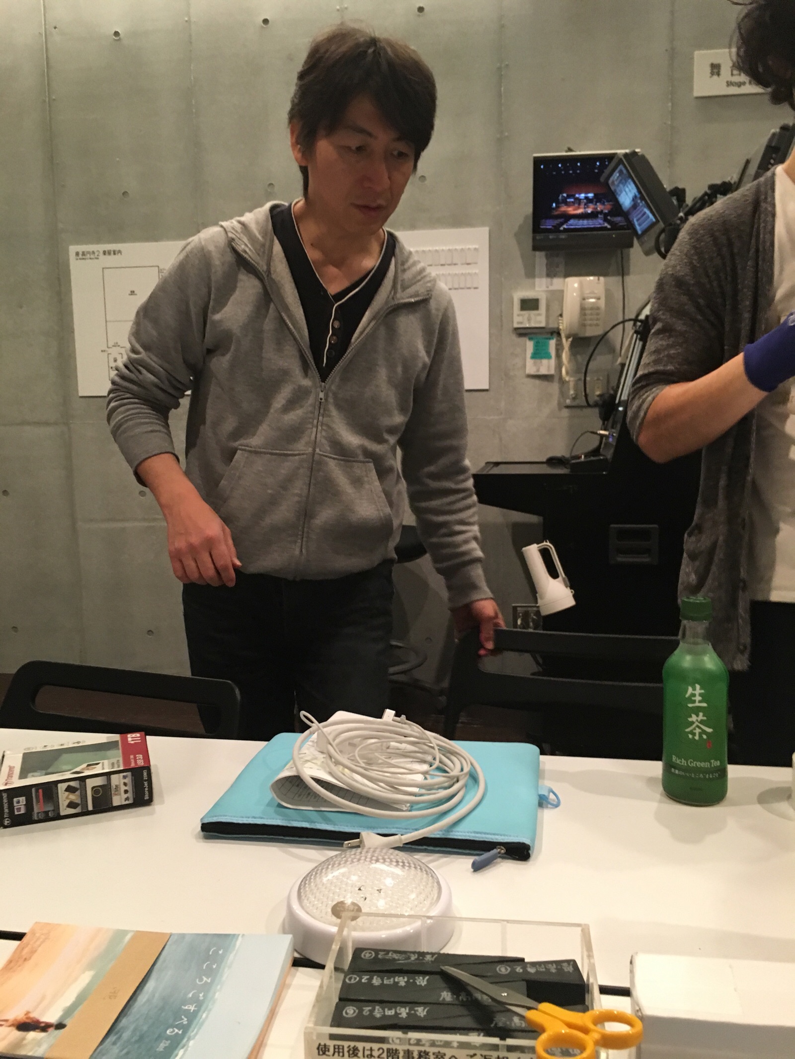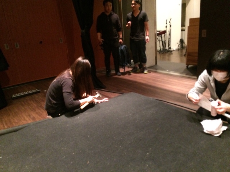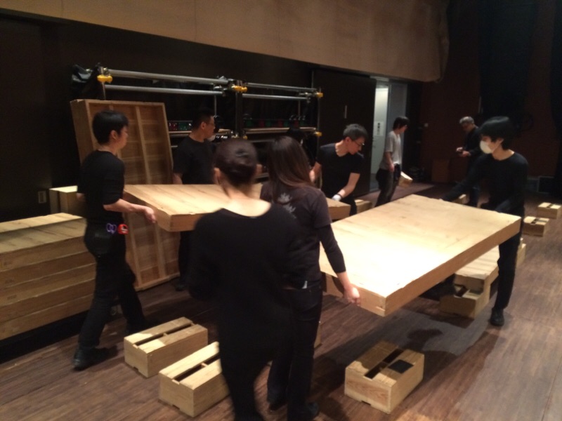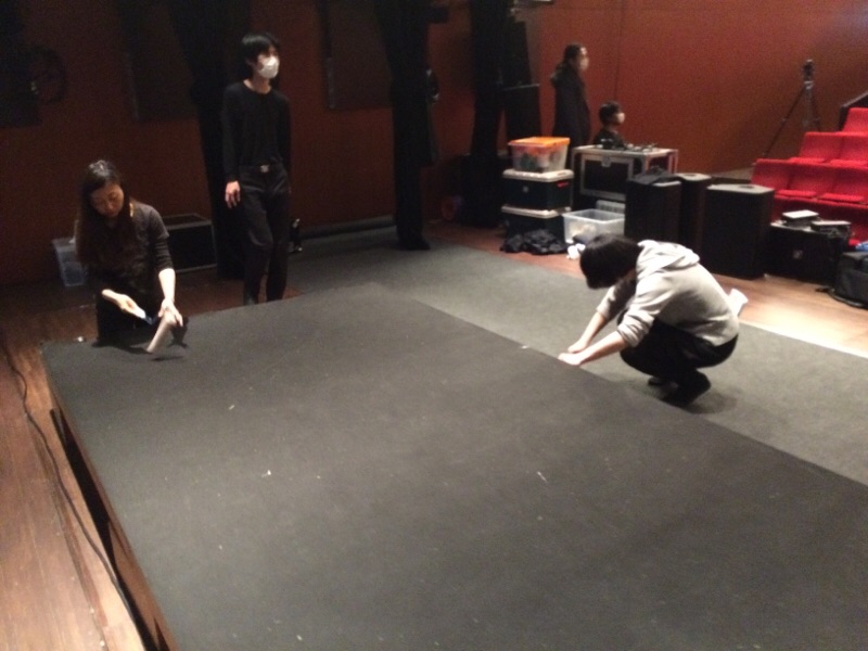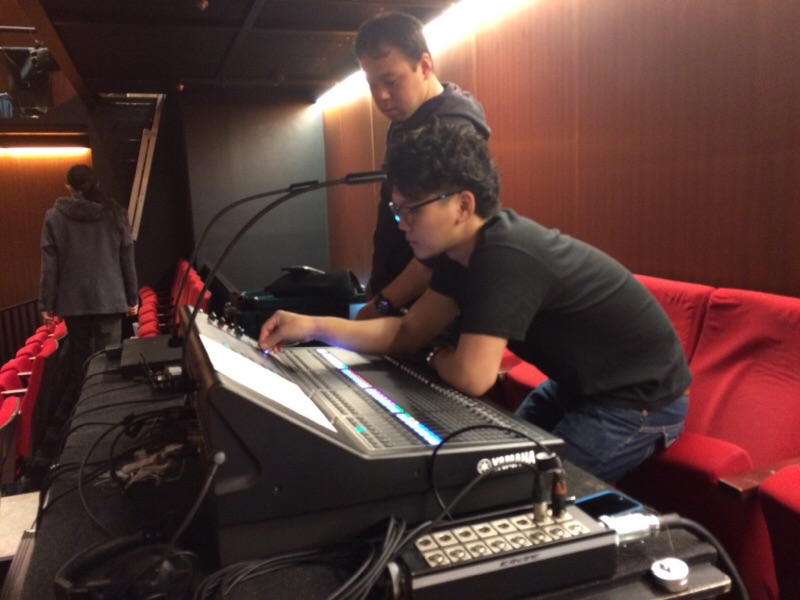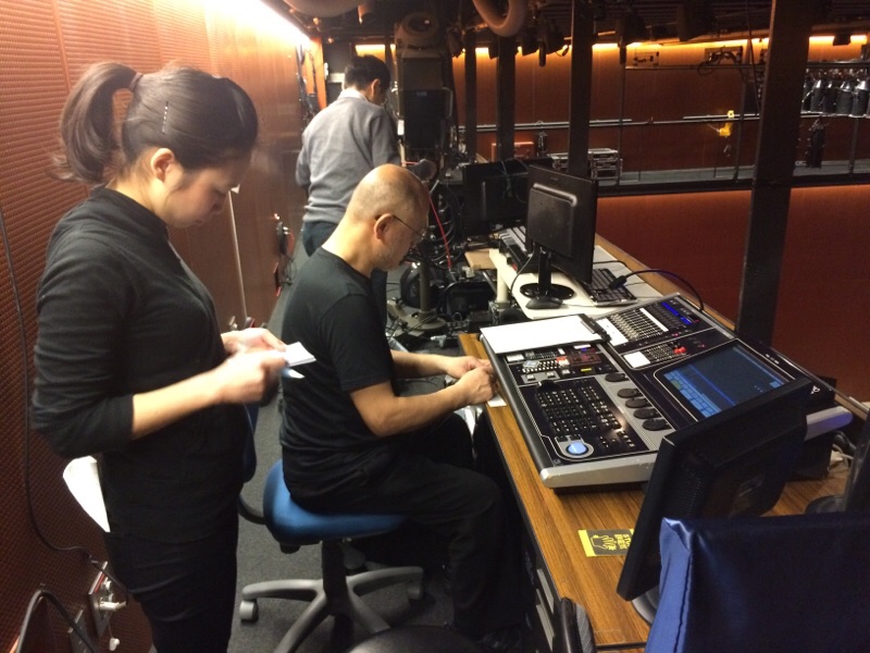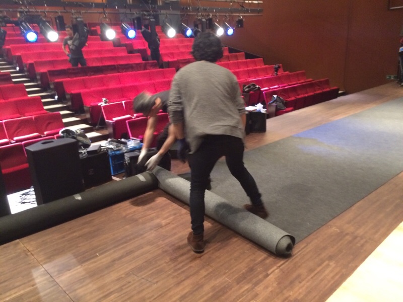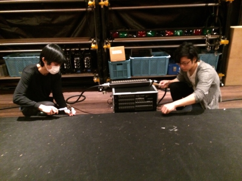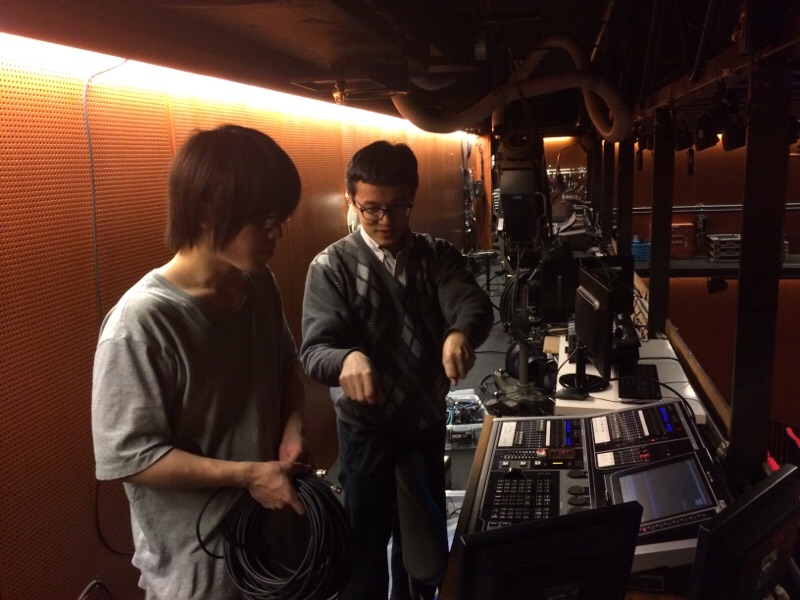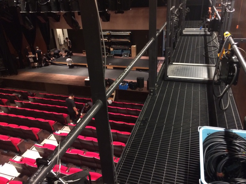 会場の後ろの上の照明の所に映像ブースを設置します。 クロちゃんもお手伝いしています。 ヨセフ