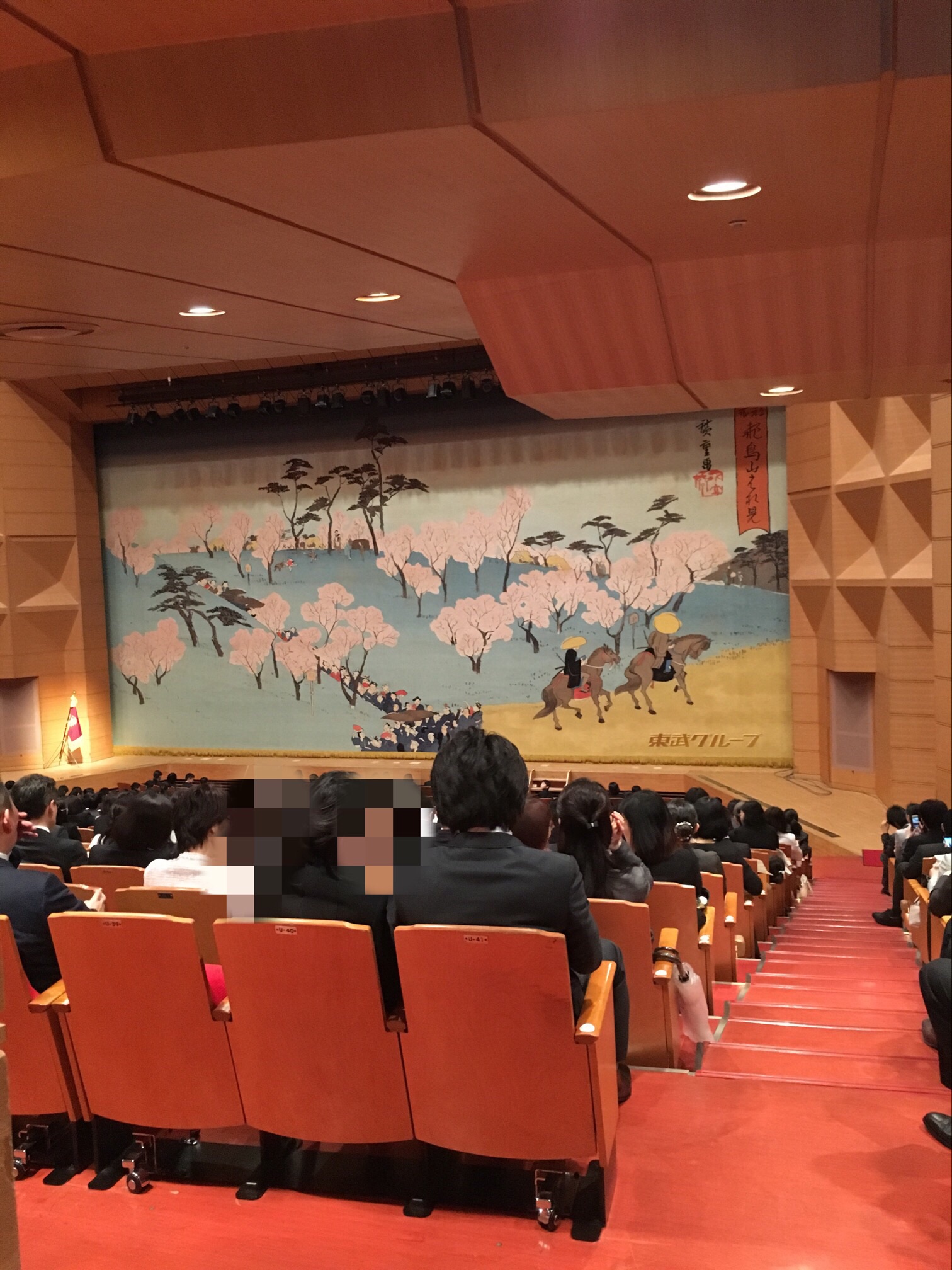 今日は入学式。 ホール近くの飛鳥山公園の桜にちなんで緞帳も桜です。 テモテ