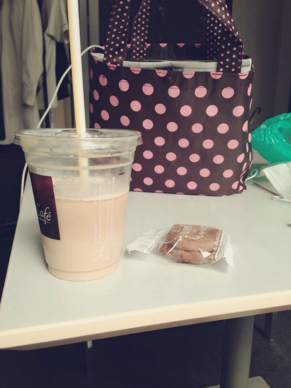 朝御飯は食べれず、アイスのカフェラテと、クッキーです。