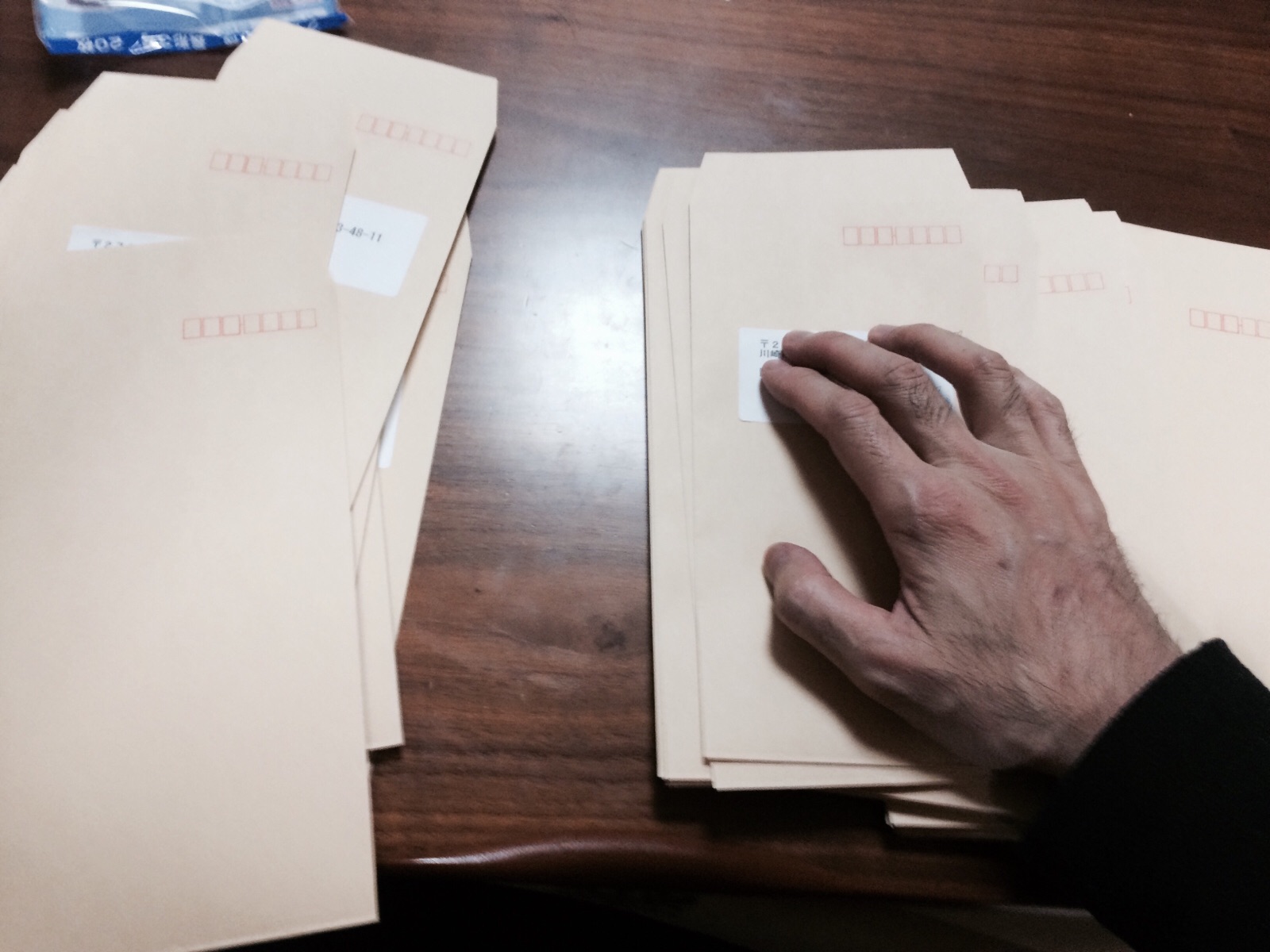 リピーターの方々への案内を送るため封筒を用意します。 裏方テモテ