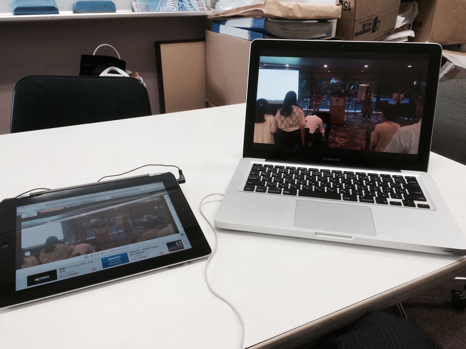 今日も小部屋でオンライン中継見れそうです。MacのバックアップにiPadがあります。どちらも貸与品。感謝です。 裏方テモテ