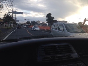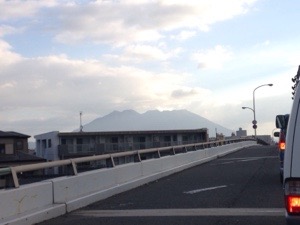 桜島が見えてきました。標高1200くらいあるそうです。道は渋滞しています。 kosuda
