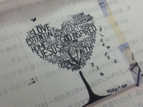西宮の週報のフィンランド教会の壁画のアップです。JESUSやFAITH、LOVEなどの言葉でハートの木が書かれています(⌒▽⌒) 兵庫のN