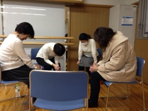 正座でセッティング中♫ 日本人ですね〜(^^) 関西合同聖会19:00〜