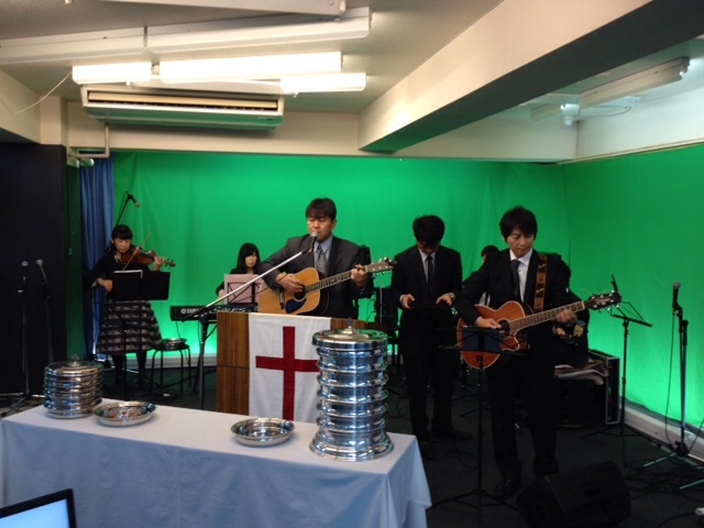 礼拝スタート! 広田牧師チームが賛美リードしています。