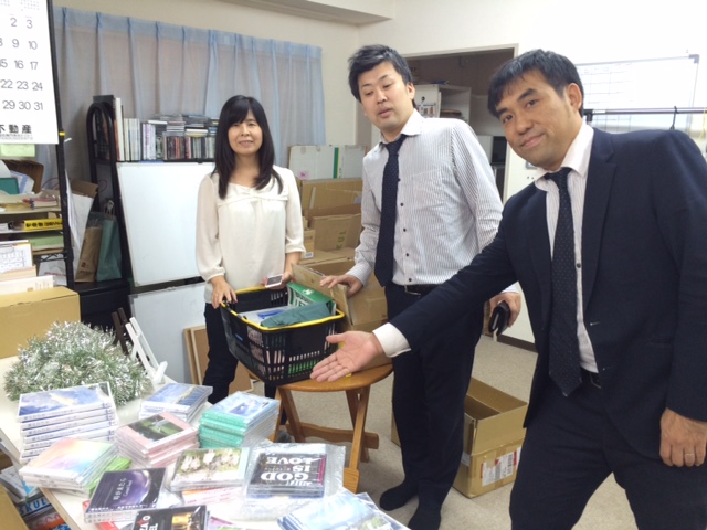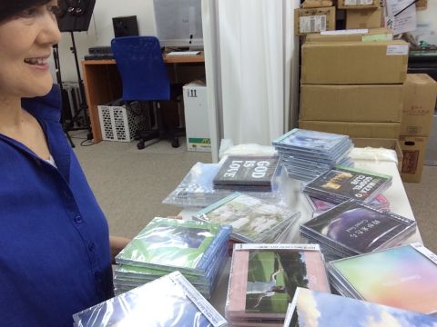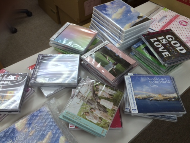 商品準備中のところへGiftsの皆さんがCDを取りに来られました!明日はGifts のCDも展示します。 荒地に川ミュージック Ruth Y