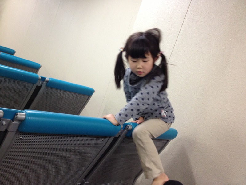飛行機が遅れているため、暇をもてあまして空港の椅子がアスレチックと化してます…。