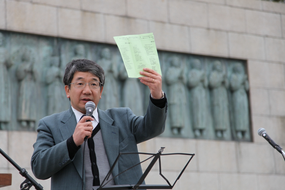 映像をインターネットで配信する為に1台のカメラと1人のカメラマンは中央に。写真で木原牧師以外に立っている人がそうです。ちょと後ろの皆さんには気にかかるところです(すみません!)。西坂から世界へ配信されています。