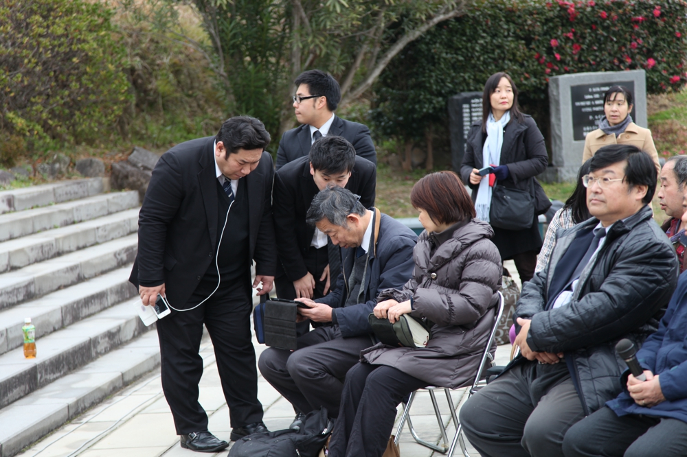 みんな真剣。iPadで殉教聖会ブログをチェックする秋元牧師。