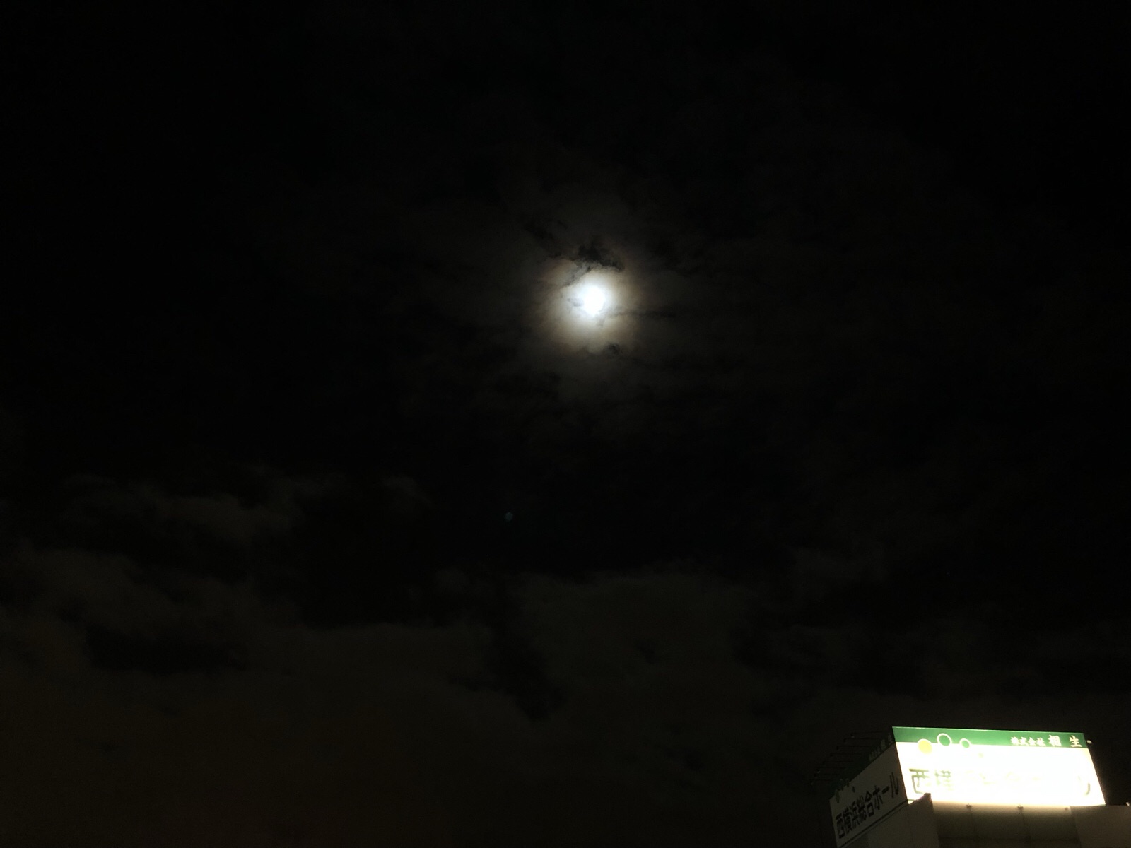 曇ってますが、満月です。 右下は看板。 徹夜祈祷会に参加したいなあと思いつつ、終電問題があるので帰ります。 yuko