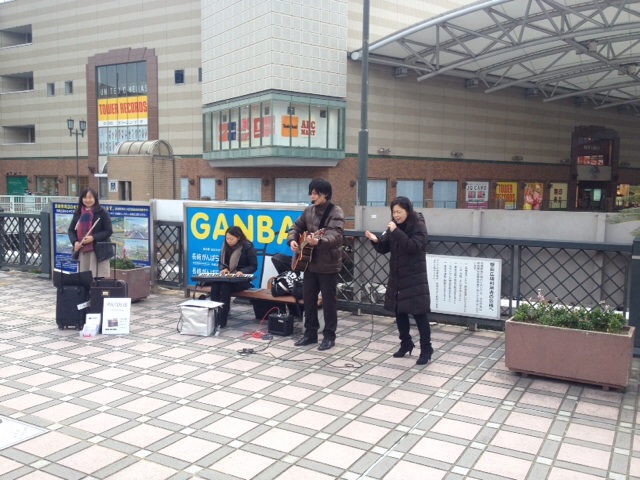 パトリスが駅前で路上ライブをしていました。