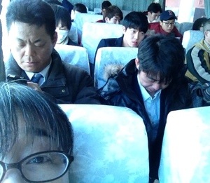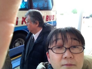 空港から長崎駅前のバスにのり、これから西坂に向かいます。 さっそく、ブログアップに勤しむジョイさん。