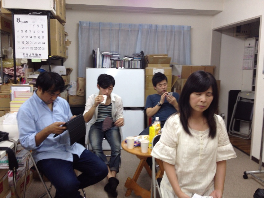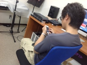 試聴してます。 みんな真剣です。 ん?‥ブログアップに真剣?