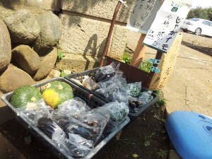 近所の農家で採れたての野菜を販売しています。どれでも100円。 「掘りたて」のジャガイモも! (^^)♪