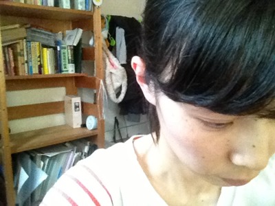 まずは、このブログ投稿設定から! 後ろの乱雑に本が積まれている本棚には目を向けないでください^^;