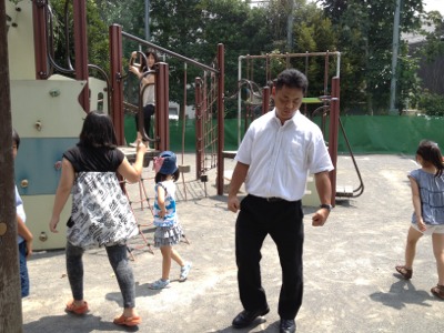 おに役はシオンちゃんからダビデくんに、逃げる瞳ちゃん。