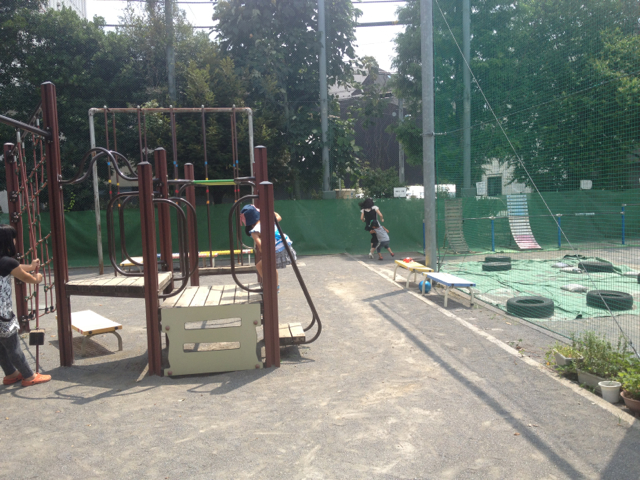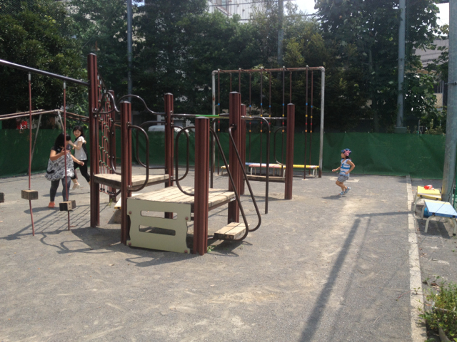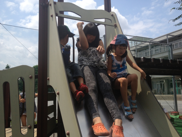 滑り台から一緒にすべります。