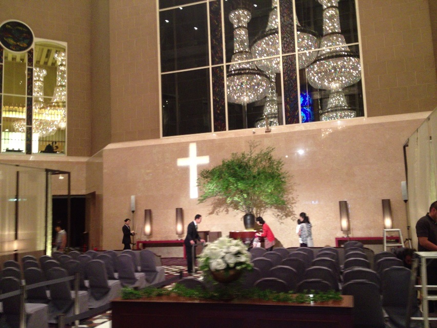 東京カリスマ聖会の会場に着きました。十字架があってビックリしましたら、ブライダルフェアのようです。