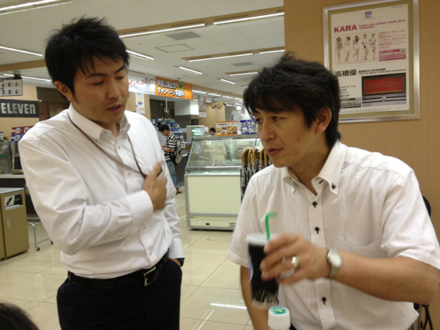 三本松牧師と光牧師 食事しながら今日のカリスマ聖会の打ち合わせしています。