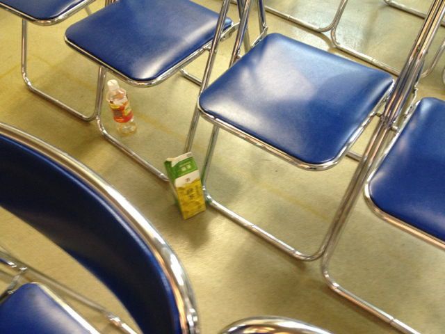 誰もいない会堂に、なぜか紙パックのお茶のカラが!この場所に座っていたのはブログ部長かな?