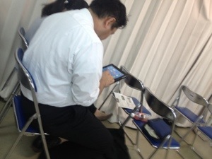 メッセージ中にリュックから、おもむろにiPadを取り出し、インターネットをチェック中!さすがブログ部長 (^-^)