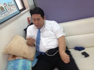 真境名牧師の指定席はソファー席の端っこ!だいたいここでインターネットのチェックをしています!