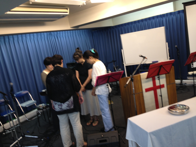 賛美の準備のお祈り中の広田牧師。