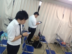 副責任者の笠原牧師とブログ部長の真境名牧師!iPhone、iPadでブログのチェック中!私のブログもチェックされてますけど(°_°)