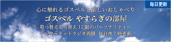 インターネットラジオ「ゴスペルやすらぎの部屋」、毎日19時に更新されます。オリジナルゴスペルやすらぎの歌を、12組のパーソナリティによる軽快なトーク?とともにお楽しみください!!!