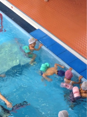 息子の初!プール教室です。 (青い帽子が息子。) 「みんなが終わってももぐり続けています。」と息子のマイペースさが伝わるばあばからのコメントがありました。