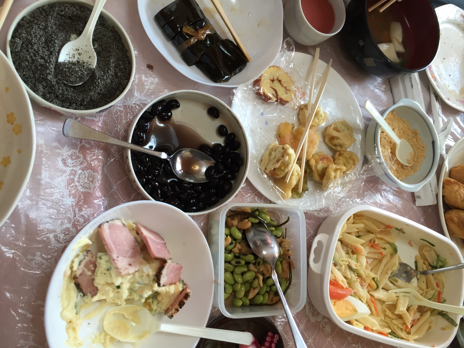 礼拝後はお楽しみ、持ちよりで食事です。お雑煮や昆布巻き、、、