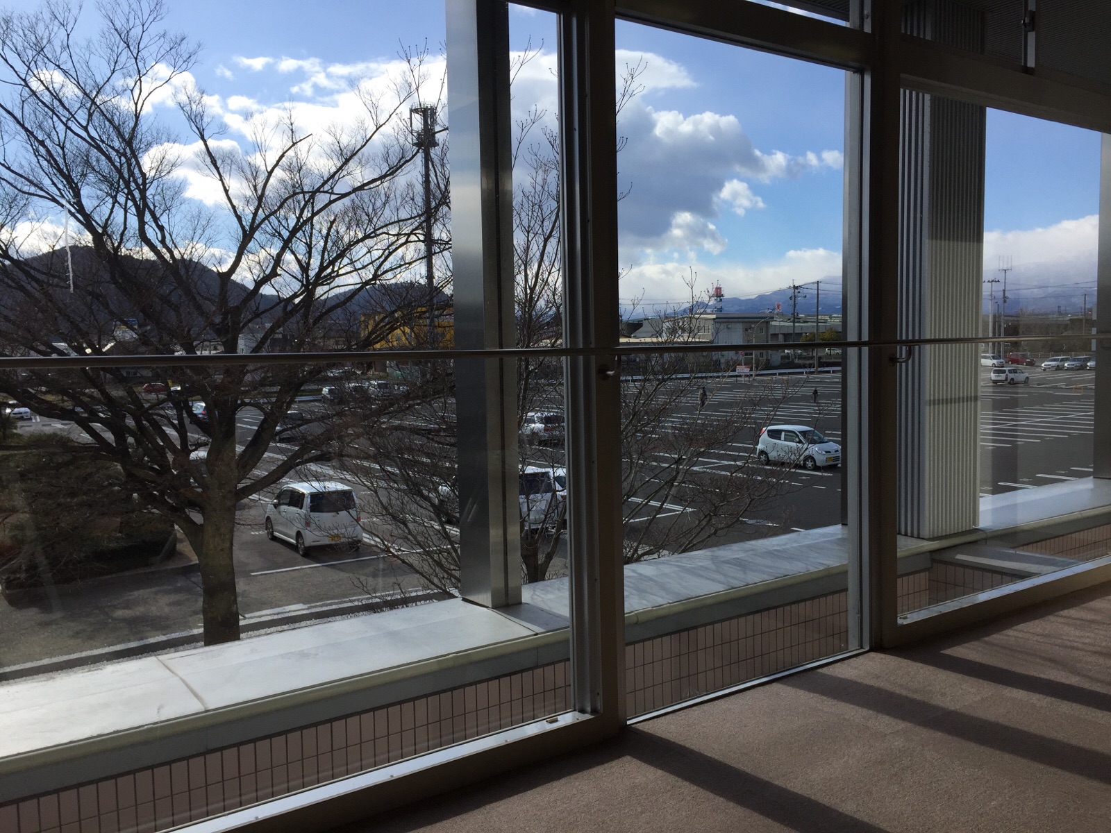 特別礼拝の会場からの福島の外の様子。晴れたり曇ったり、でも日差しは暖かい(^ ^) 写真をよく見ると駐車場で凧上げしている方がいます。 福島M