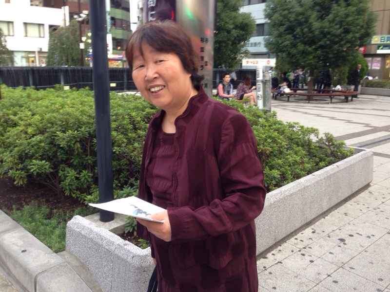 やはり、結婚式帰り。笑顔の辻郷さん!今からウラノスの路上ライブと共に、いやしの集いのチラシ配りをします!エステルYS