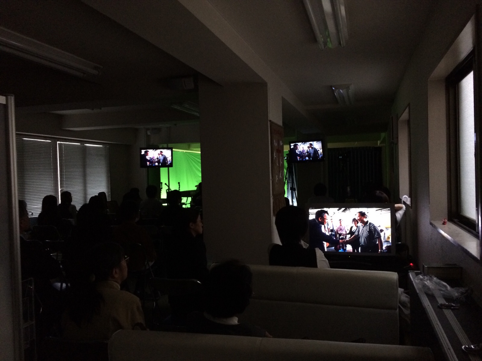 オーケストラの皆さんも、そうでない皆さんも、皆で台湾チームの映像を見ています。