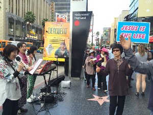 榊牧師と小野島婦人、路上ライブなさっています。ハリウッドの風に美しいハーモニーの声が響いてます。便乗して児童養護施設のパンフ配りたかったです。(灯)