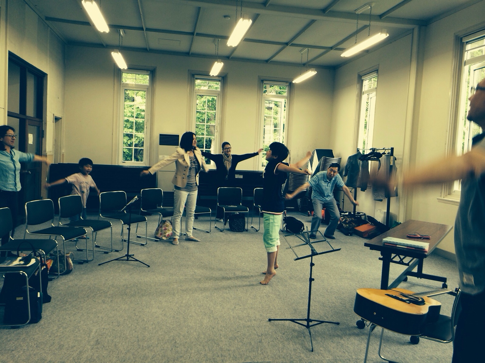 リジョイスゴスペルクラブでした。 ストレッチ?ラジオ体操? から始めます。 北アンテオケ教会