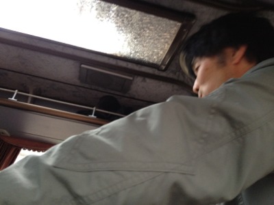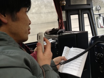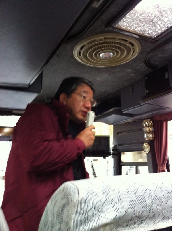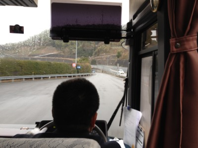 雨の中、高速に入りました。 バス内は、テモテ牧師が「風のひびき」から賛美を導いてます。